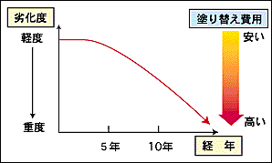 | Q1:何のために塗料が建物に塗られているのですか? A1:もちろん建物自身の見栄えをよくするといった視覚的要素もありますが、建物を外的環境から保護すると いった要素が大きなウエイトを占めています。 建物を保護している塗膜も厳しい環境のもとでは、少しずつダメージを受けて、やがてひび割れを生じたり、 ハガレを生じたり建物自体のダメージにつながっていきます。 |